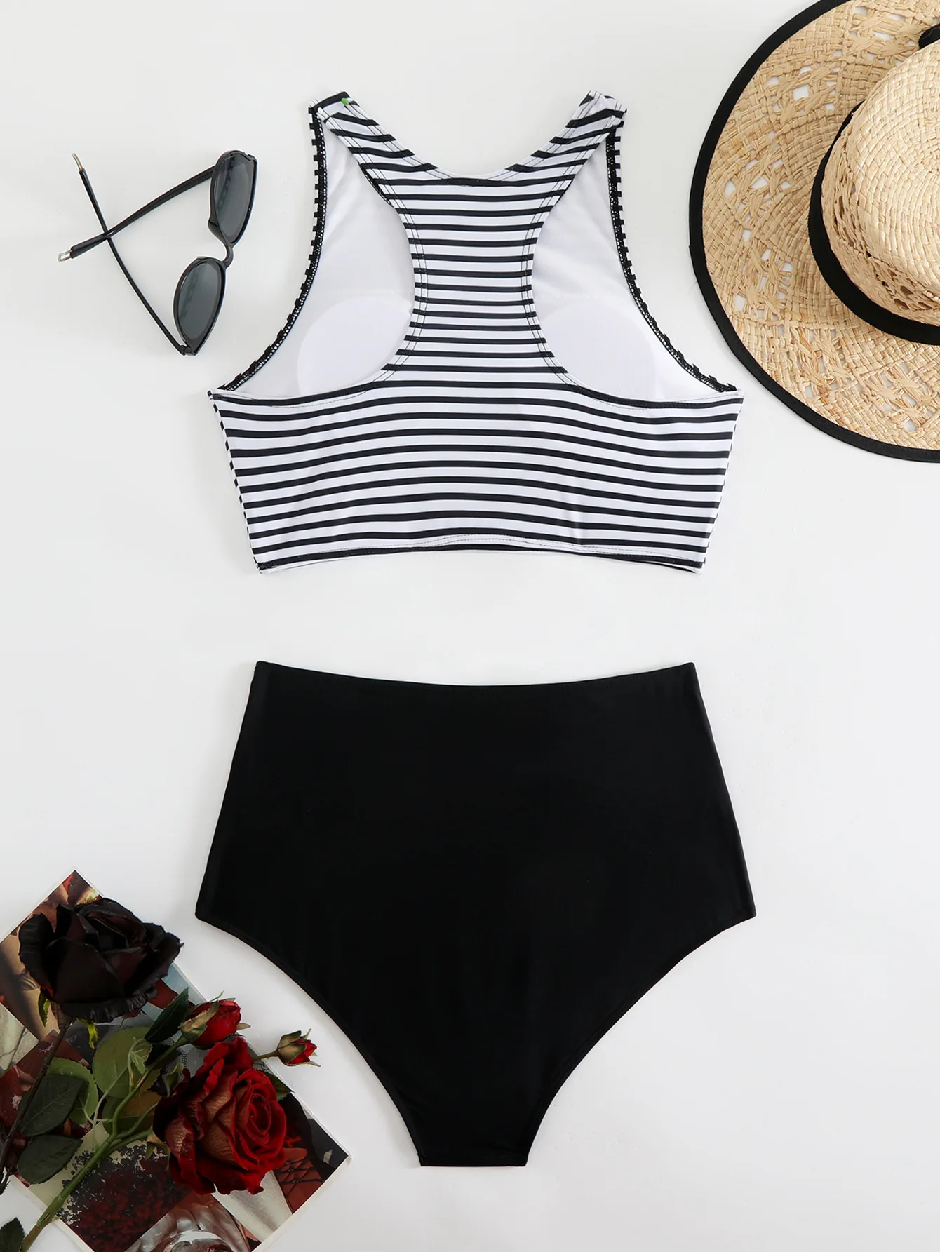 This bathing suit features a fashionable striped design that adds a chic and modern touch to your beachwear collection, perfect for standing out this summer.