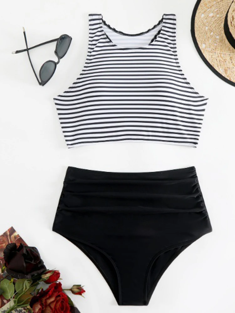 Circyy Striped Bathing Suit Women Fashion Two-pieces Swimwear High Waisted Solid Bikini Set Summer 2025 New Holiday Beachwear