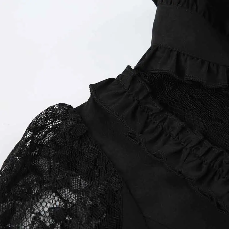 IAMSURE Vintage Dark Patchwork Lace Blouse Gothic See Through Turtleneck Long Sleeve Shirts Women 2025 Spring Autumn Streetwear
