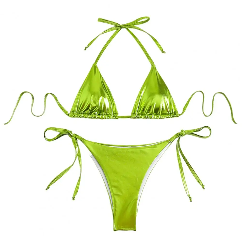 Solid Color Halter Neck Strap Thong Women Swimsuit Two Pieces Bikini Set Bronzing Surface Lace-up Briefs Beach Swimwear Swimsuit