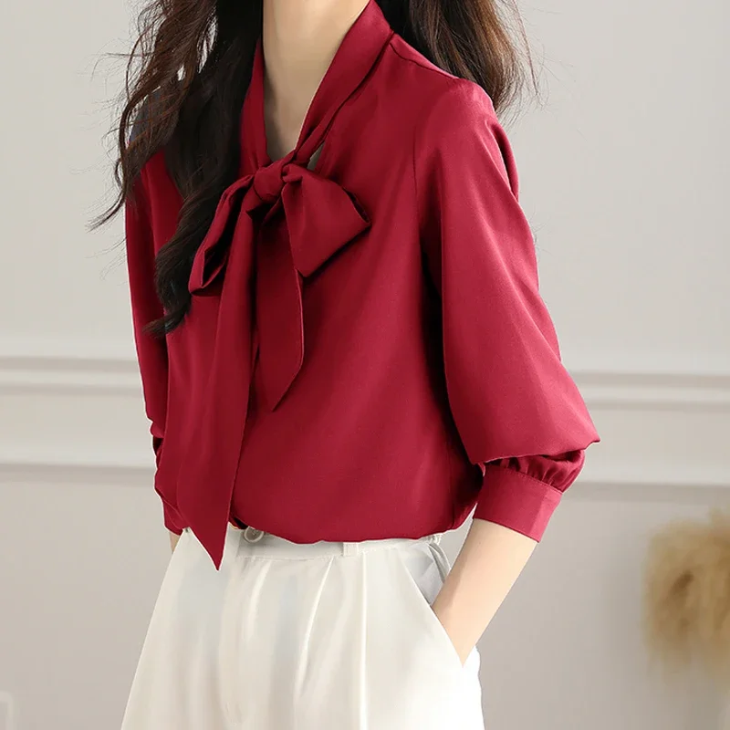 Women Elegant Solid Chiffon Shirts For Women Long Sleeve All-match Bow Blouses Vintage Basic Tops Femme Fashion New